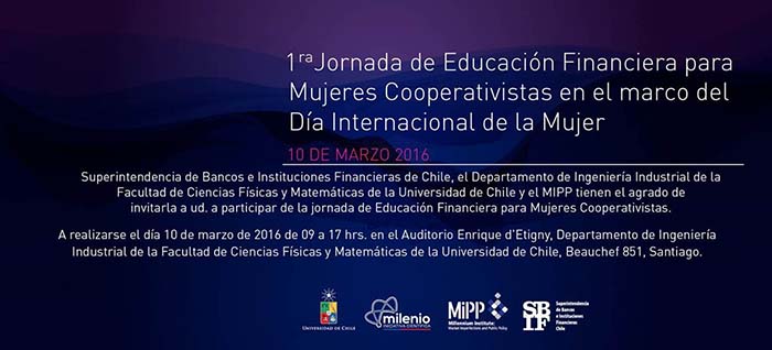 (Beauchef 851, Santiago)Con el objetivo de conmemorar y celebrar el Día Internacional de la Mujer, el Instituto Milenio para la investigación de Imperfecciones de Mercados y Políticas Públicas (MIPP), en conjunto con la Facultad de Ciencias Físicas y Matemáticas (FCFM) de la Universidad de Chile, la Superintendencia de Bancos e Instituciones Financieras (SBIF), y la Federación Chilena de Cooperativas de Ahorro y Crédito (FECRECOOP), realizarán la primera versión de la jornada de educación financiera dedicada a las mujeres cooperativistas.