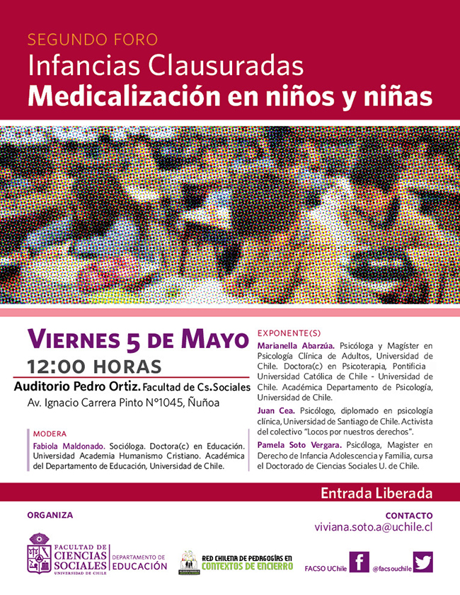 El Segundo Foro Infancias Clausuradas "Medicalización en niños y niñas" se realizará este viernes 05 de mayo 2017 a las 12.00 horas en el Auditorio Pedro Ortiz de la Facultad de Ciencias Sociales de la Universidad de Chile.