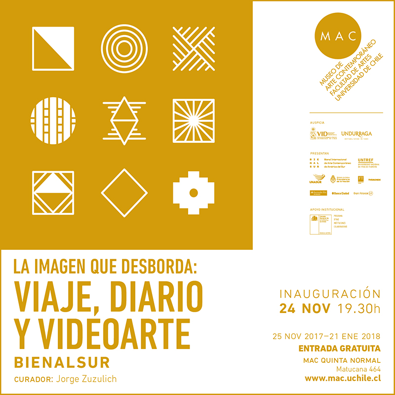 (Av Matucana 464, Quinta Normal, Santiago, Chile)La imagen que desborda: viaje, diario y videoarte, es una exhibición de video-arte que se presentará gratuitamente en el MAC de Quinta Normal desde el 24 de noviembre de 2017 hasta el 21 de enero de 2018, como parte de las exhibiciones que se realizarán en el marco de la Bienal Internacional de Arte Contemporáneo de América del Sur (BIENALSUR).