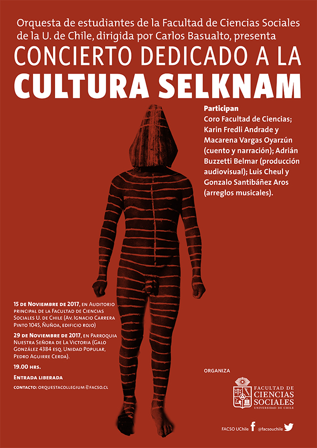 La pieza que presentará la Orquesta de la Facultad de Ciencias Sociales, en su nuevo concierto, corresponde a la creación de una obra dedicada a las culturas étnicas de nuestro país, y será ejecutada por estudiantes de diferentes carreras de la Universidad de Chile. La obra Selknam contará con la participación del Coro de la Facultad de Ciencias, creación y narración de una alumna de la carrera de literatura Hispánica, más la producción audiviosual.