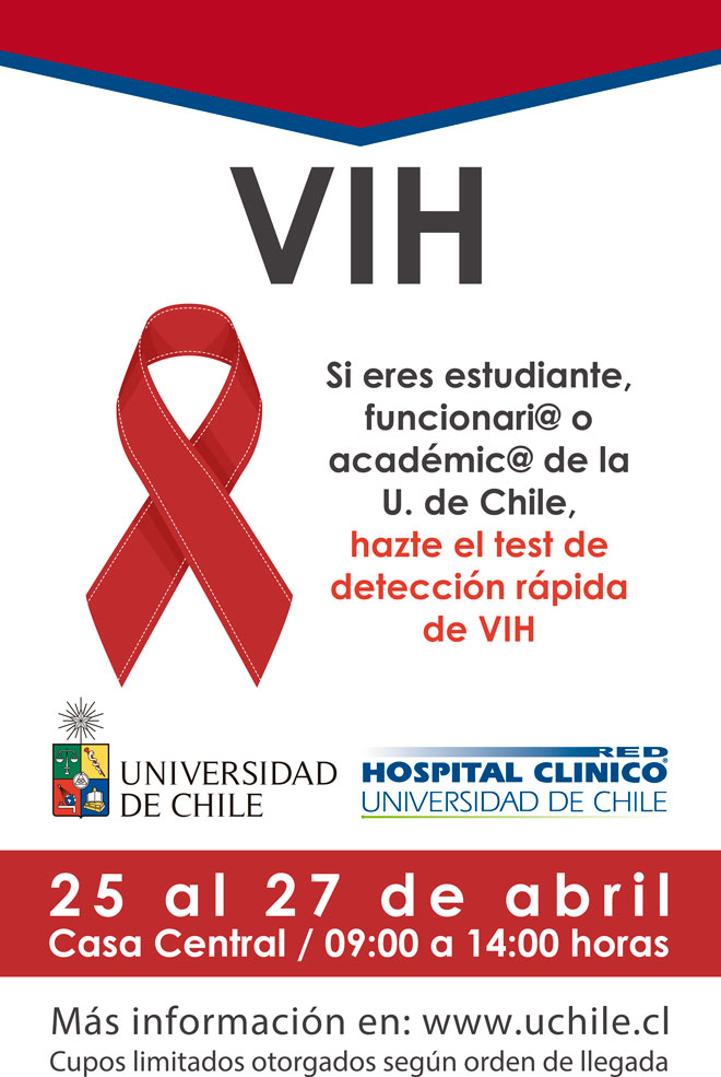(Avenida Libertador Bernardo O'Higgins 1058, Santiago)Estudiantes, académicos y funcionarios de la Universidad de Chile podrán realizarse el test rápido de VIH en los patios de la Casa Central de nuestro plantel*. Serán mil test que estarán a disposición de la comunidad universitaria el marco de la campaña impulsada por la Casa de Bello y el Hospital Clínico. La iniciativa se llevará a cabo durante los días 25, 26 y 27 de abril, de 09:00 a 14:00 horas.