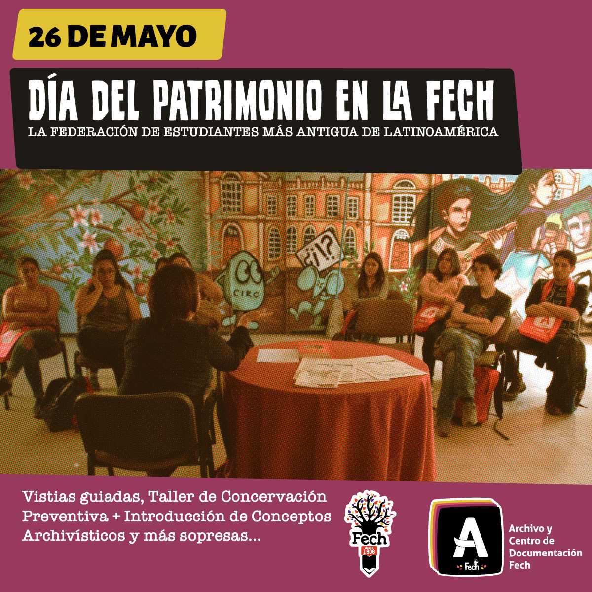 (Periodista José Carrasco Tapia #9 )Como parte de la celebración del "Día del Patrimonio Cultural", el Archivo FECH realizará una visita guiada por los distintos espacios de la Casa FECH, contando la historia del edificio, haciendo énfasis en su uso como Cuartel General de la DINA, y también explicando su uso actual como sede de la Federación de Estudiantes de la Universidad de Chile.