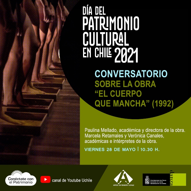 (-)En el marco del Día del Patrimonio 2021, el Departamento de Danza de la Facultad de Artes ha organizado un conversatorio sobre El Cuerpo que mancha, propuesta coreográfica estrenada en 1992 y dirigida por la coreógrafa y hoy académica y subdirectora del Departamento de Danza, Paulina Mellado.
