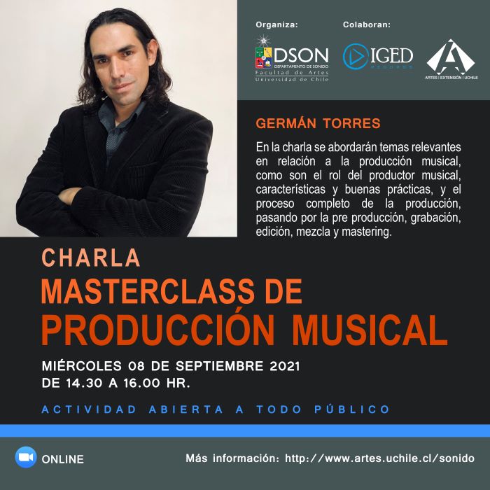 (Online)En la charla abierta a todo público se abordarán temas relevantes en relación a la producción musical, como son el rol del productor musical, características y buenas prácticas, y el proceso completo de la producción, pasando por la pre producción, grabación, edición, mezcla y mastering.