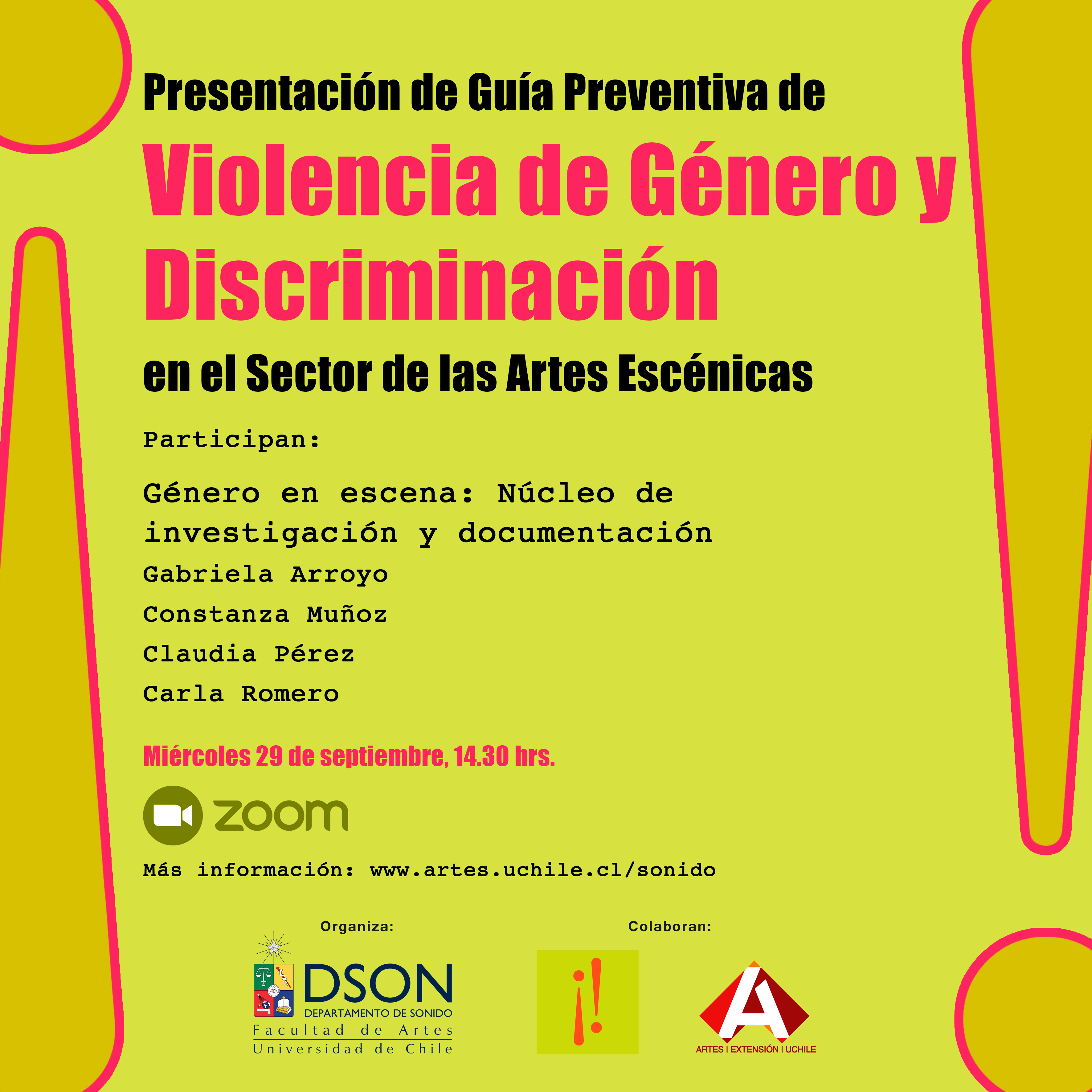 (Zoom)El miércoles 29 de septiembre, entre las 14:30 y 16:00 horas, se realizará la presentación de la “Guía Preventiva de Violencia de Género y Discriminación en el Sector de las Artes Escénicas y Audiovisuales”. A cargo del grupo Género en escena: Núcleo de investigación y documentación, compuesto por Gabriela Arroyo, Catalina Devia, Constanza Muñoz, Claudia Pérez y Carla Romero, en la instancia se expondrán los antecedentes más relevantes para la creación de la guía preventiva de violencia de género y discriminación en las artes escénicas y audiovisuales, documento que se encuentra disponible para libre descarga, aquí.