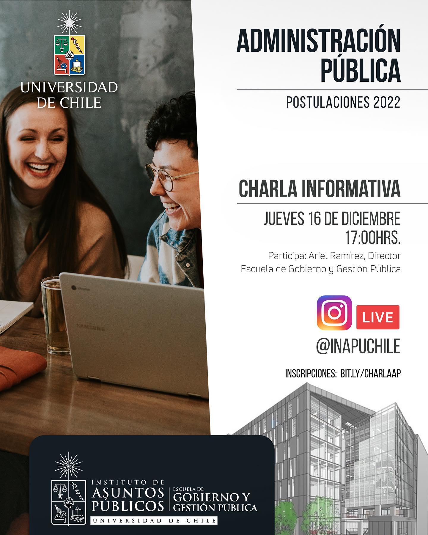(bit.ly/charlaap)Este jueves 16 de diciembre a las 17:00 hrs, se llevará acabo una charla informativa sobre Administración Pública, postulaciones 2022.