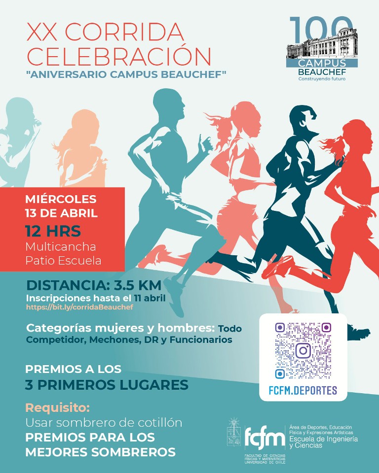 El miércoles 13 de abril, a partir de las 11.30 hrs en la multicancha patio escuela se realizará la entrega de números para participar en la XX Corrida 100 Aniversario Campus Beauchef.