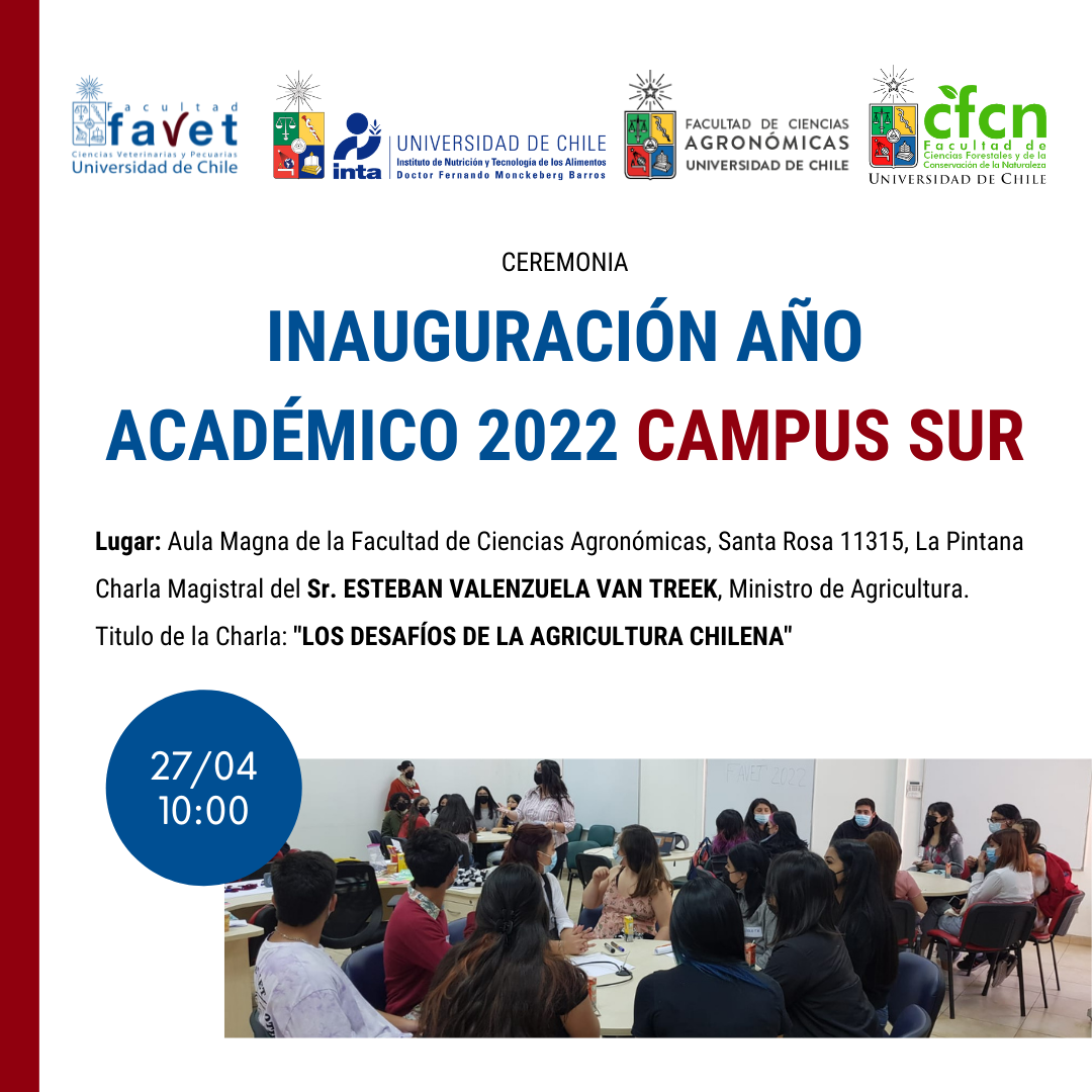(Facultad de Ciencias Agronómicas)La Facultad de Ciencias Veterinarias y Pecuarias, a cargo de la coordinación de Campus Sur, celebrará la Inauguración del Año Académico 2022 del recinto universitario con un encuentro presencial en el Aula Magna de la Facultad de Ciencias Agronómicas, que contará con la Clase Magistral del Ministro de Agricultura, Sr. Esteban Valenzuela, "Los Desafíos de la Agricultura Chilena", y una presentación especial del Ballet Folclórico Antumapu en el marco de la celebración de sus 50 años de trayectoria artística.
