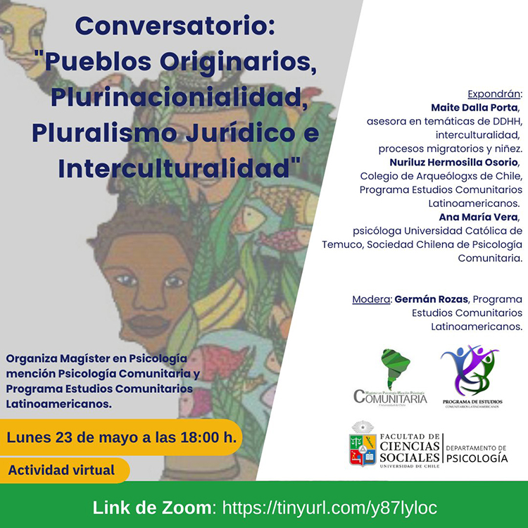 (Plataforma digital)El Magíster en Psicología mención Psicología Comunitaria, en colaboración con el Programa de Estudios Comunitarios Latinoamericanos, realizarán el conversatorio "Pueblos Originarios, Plurinacionalidad, Pluralismo Jurídico e Interculturalidad".