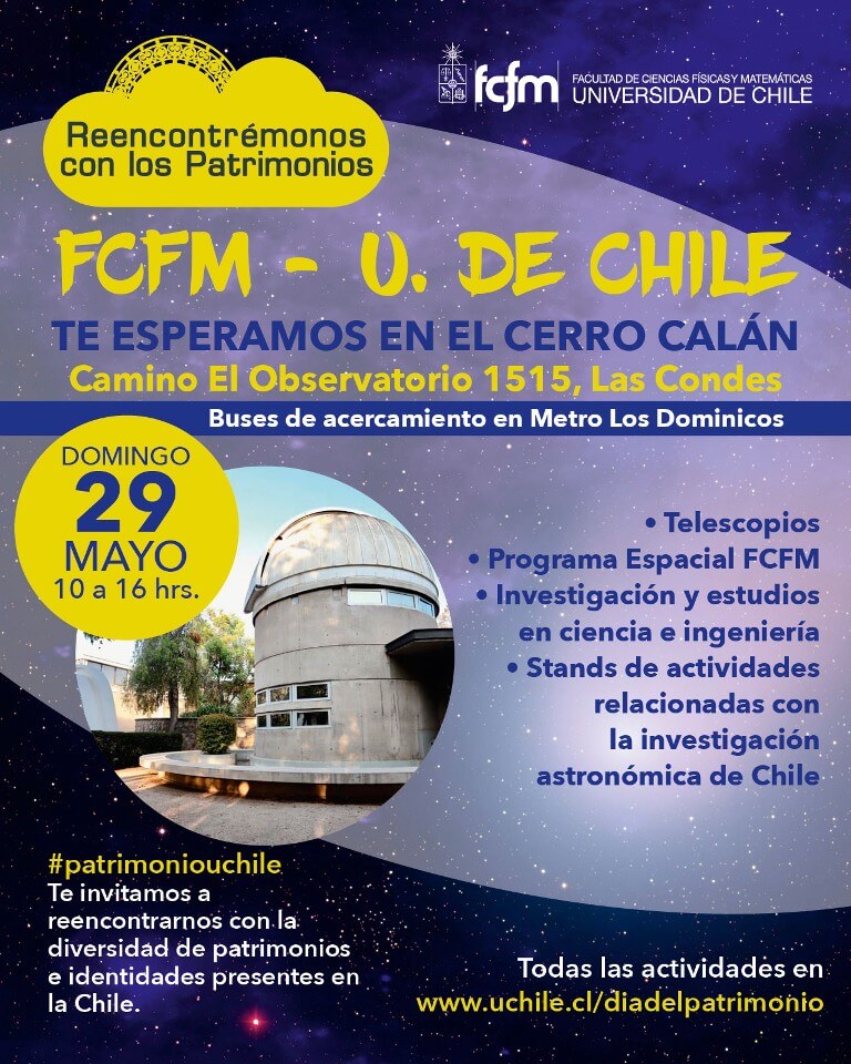 (Camino El Observatorio 1515, comuna de Las Condes.)En el marco del Día de los patrimonios, el domingo 29 de mayo la FCFM se suma al llamado a la ciudadanía para disfrutar de una jornada en las dependencias del Departamento de Astronomía, instalado en el Parque Observatorio Cerro Calán, ubicado en la comuna de Las Condes.