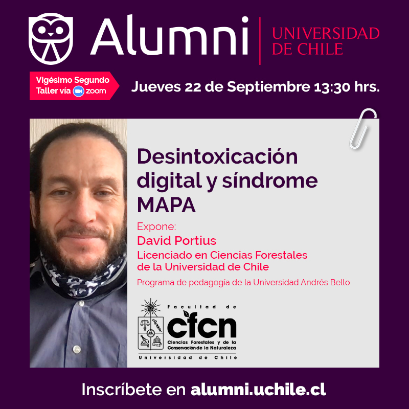 📌 El próximo jueves 22 de septiembre, desde las 13:30 horas, únete al nuevo taller Enseña Alumni "Desintoxicación digital y síndrome MAPA", por el egresado de la Facultad de Ciencias Forestales y de la Conservación de la Naturaleza, David Portius.