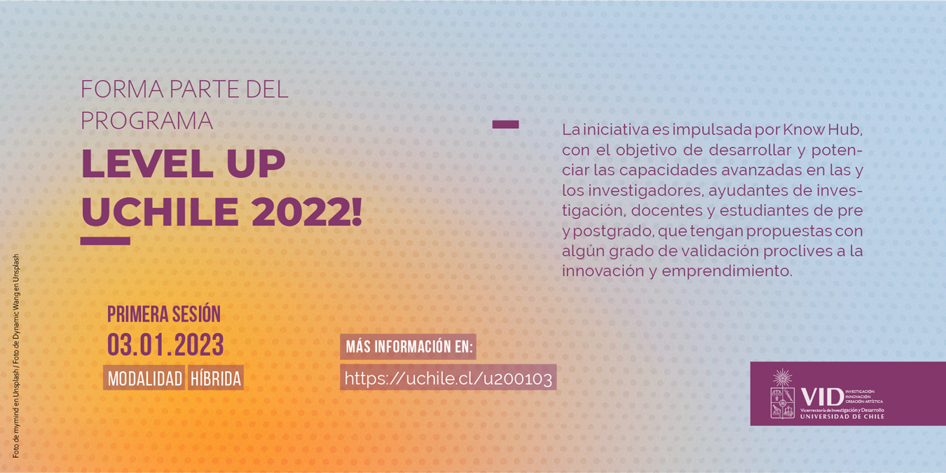 En esta ocasión, desde el martes 03 de enero del 2023 hasta el 26 de enero de 2023, se llevará a acabo el Programa Level Up UChile 2022. La iniciativa busca desarrollar capacidades avanzadas para transformar el paradigma del ecosistema universitario hacia el desarrollo de tecnologías con potencial comercial y social, ampliando la capacidad y talento regional, con proyección global.