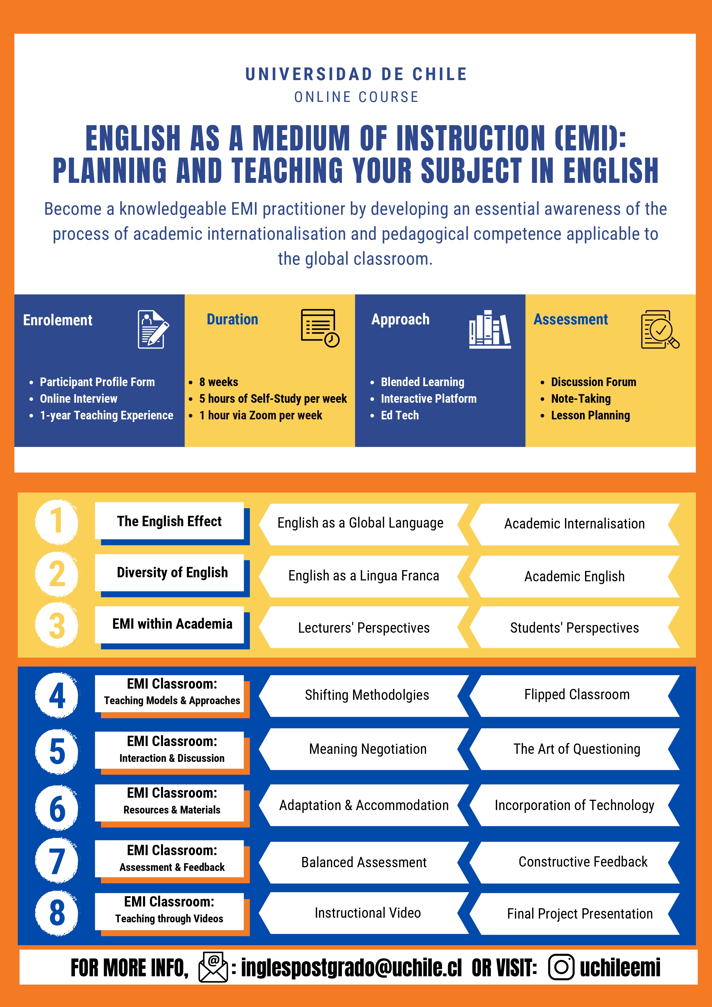 Universidad de Chile is pleased to offer this 8-week-long blended online course for all academic staff (including Ph.D. students) who wish to acquire the necessary strategies and techniques for the successful delivery of their academic subject through English.