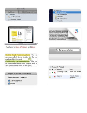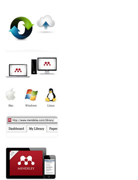 Permite gestionar y compartir documentos de investigación, encontrar nuevos datos y colaboración en línea. Mendeley combina Mendeley Desktop, una aplicación de gestión de PDFs y gestión de referencias (disponible para Windows, Mac y Linux) con Mendeley web, una red social online para investigadores.