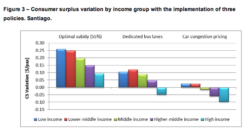 Segregating traffic through bus lanes seems to be particularly appealing, as it achieves large welfare improvements without subsidies or cumbersome car congestion tolling, affecting bus and car travellers through quality of service (speeds) instead of monetary prices. Moreover, the bus lane policy induces the largest increase in frequency for both cities, and it does so without the use of subsidies, which are often defended as a mean to, indeed, increase frequency. For the case of Santiago, where data enables a full distributional analysis, we further find that congestion pricing happens to be a progressive measure if the transit system improves to cover the new demand, even before using revenues from tolls or correcting the user benefits measure for income differences. This is an important point as one of the usual critiques against congestion pricing is that it would be regressive, by pricing off the streets those who benefit least from the speed increase due to low values of time, and therefore, with lower income. As Figure 3 shows, we further find that dedicated bus lanes are also progressive, and that optimal transit subsidization benefits all travellers.