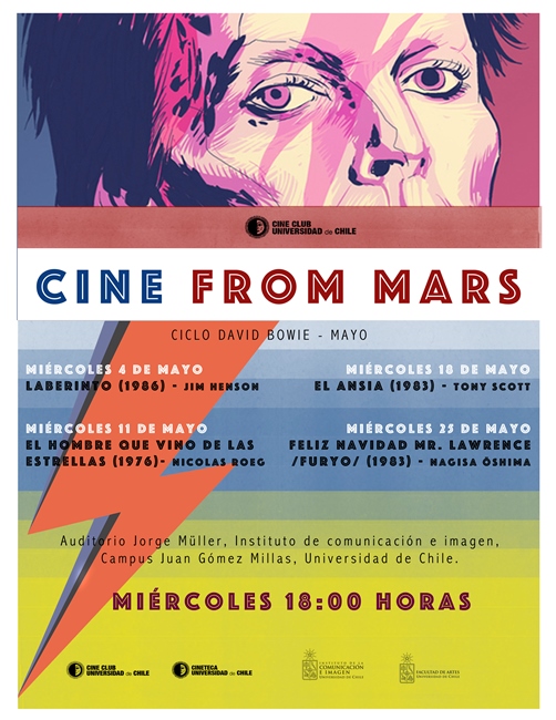 Laberinto (1986, de Jim Henson), El hombre que vino de las estrellas (1976, de Nicolas Roeg), The hunger (1983, de Toni Scott) y Feliz Navidad Mr. Lawrence (Furyo) (1983, de Nagisa Oshima), son las películas que el público podrá ver de manera gratuita los días 4, 11, 18 y 25 de mayo, respectivamente a las 18:00 hrs. en el Auditorio Jorge Müller del Instituto de comunicación e imagen, ubicado en el Campus Juan Gómez Millas de la Universidad de Chile (Ignacio Carrera Pinto 1045, Ñuñoa).