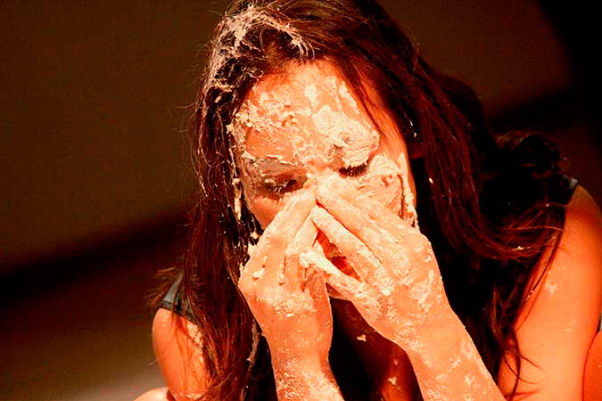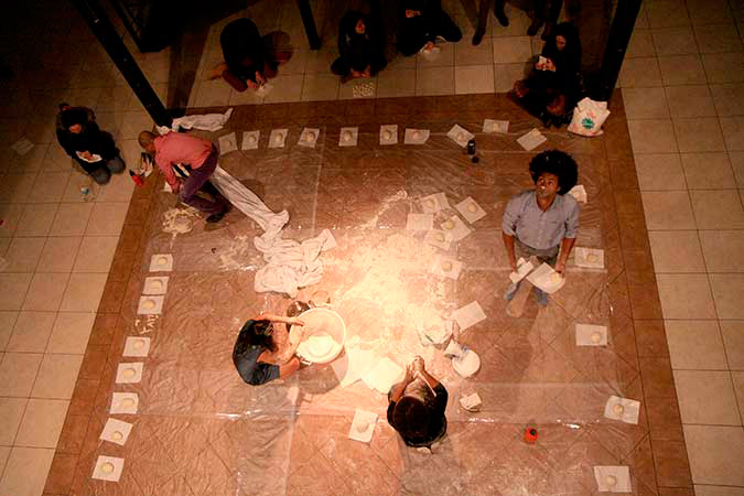El público observó cómo uno de los integrantes de grupo cargó la harina hacia el escenario subterráneo; otra llevaba aceite y otro el agua, para después amasar y armar pequeñas bolas de masa en este espacio, incluyendo el cuerpo en este proceso de trabajo colectivo.
