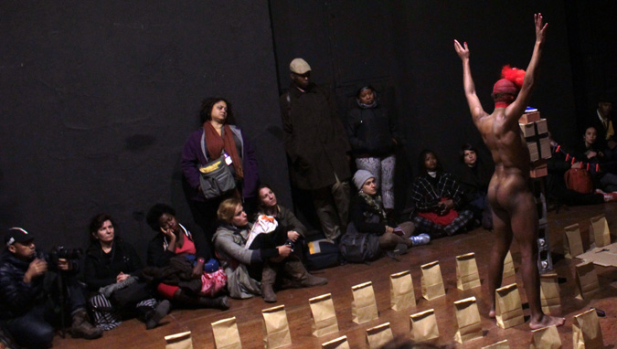 En medio de una ciudad elaborada al interior de una sala con cartuchos de papel, cartones y velas, y bloques de cemento con más cartones, rollos de masking tape y un par de botellas de cerveza para las torres, el neoyorquino Keijaun Thomas desarrolló “La distancia no es separación”. Durante la performance Thomas obró como distintos personajes, usando su cuerpo desnudo como instrumento de representación de cada personaje de la ciudad, donde se tapizó con mallas, scotch o pintura acorde al momento.