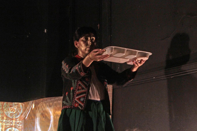 Con la proyección de imágenes de las manos una mujer picando verduras junto a una bandeja plástica sobre su cuerpo, la artista chilena Karina Prudencio sirvió para los espectadores en bandejas plásticas porciones del plato andino “Kalapurca”.