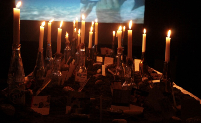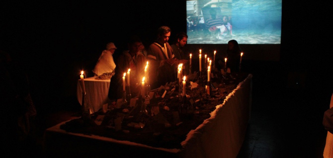El espacio albergó una mesa larga tapada con tierra donde pusieron velas blancas, piedras junto a botellas y fotos o recuerdos, otra mesa con botellas de colores, pan y frutas, y otra donde una mujer de blanco estaba lavando piedras. De fondo, música africana y olor a incienso. El espacio invitó a los participantes a recordar algún muerto caído en actos de violencia de distinto tipo, escribir su nombre en las piedras y en una tarjeta y ponerlo en la mesa central, como una forma de no olvidar.