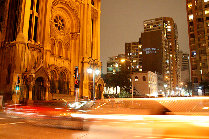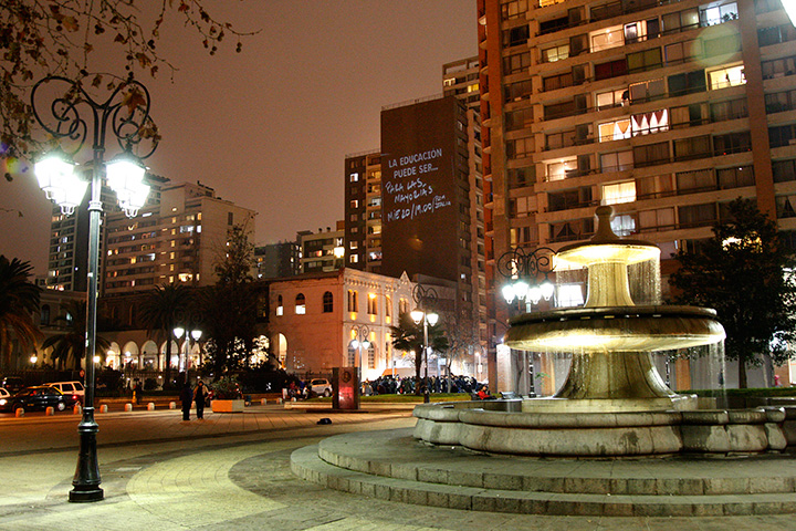 “Rebelión contra la deuda estudiantil” fue la intervención del colectivo neoyorquino “The Iluminator” a las afueras del Centro Cultural Diana. El conjunto, que se enfocó en ocasiones anteriores en otros conflictos sociales en defensa y réplica “del 99% de la población”, proyectó imágenes hacia un edificio aledaño con consignas alusivas al movimiento estudiantil. En la intervención se dió espacio al público para escribir sus propios mensajes contra la deuda universitaria, los políticos, la situación política latinoamericana y cómo tener una mejor educación. Luego de ser expuestos en el edificio, los papeles donde fueron escritos fueron pegados al vehículo donde “The Iluminator” dispuso del proyector. Esta performace se replicó el miércoles 20 en conjunto a la CONFECh en el edificio de la Facultad de Derecho de la U. de Chile.