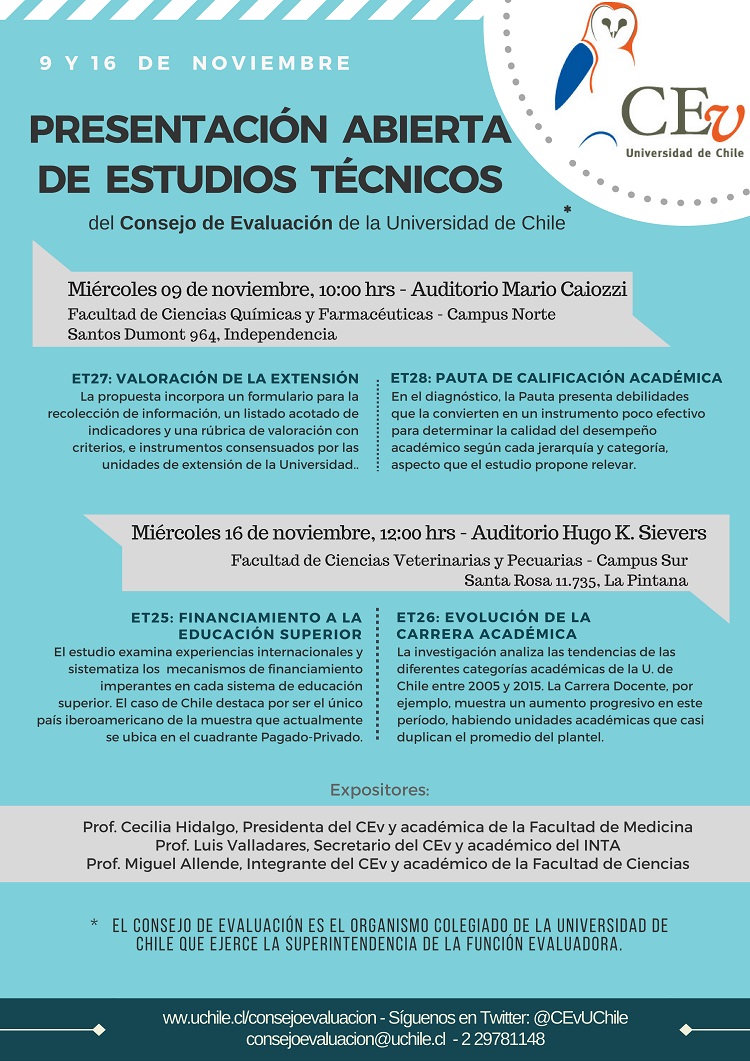 La segunda jornada de la Presentación Abierta de Estudios Técnicos 2016 se realizará el miércoles 16 de noviembre a las 12 horas en el Auditorio Hugo K. Sievers de la Facultad de Ciencias Veterinarias y Pecuarias. En esta oportunidad será la profesora Cecilia Hidalgo, presidenta del Consejo de Evaluación, y el profesor Luis Valladares, Secretario del organismo, quienes presenten los siguientes estudios: