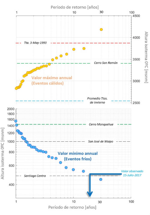 La figura adjunta también incluye el periodo de retorno de H0 considerando eventos cálidos (panel superior). El valor medio de H0 en tormentas de invierno es unos 2500 msnm y naturalmente todos los años ocurre al menos una tormenta con H0 por encima de este valor. En promedio, solo una vez cada 7 años ocurre una tormenta lo suficientemente cálida como para que llueva hasta la cumbre del cerro San Ramón frente a Santiago (3500 msnm), y la altura de H0 en la tormenta de Mayo de 1993 tiene una recurrencia cercana a los 25 años, desencadenando aluviones en la precordillera de Santiago con dramáticas consecuencias (e.g., Garreaud & Rutllant 1997).