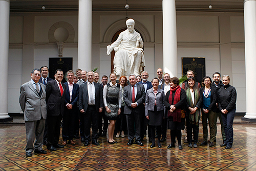 Durante la primera jornada, los 15 integrantes de la delegación alemana, encabezados por la vicepresidenta de la Universidad de Hamburgo, Susanne Rupp, se reunieron con el Rector de la Universidad de Chile, Ennio Vivaldi, el director de Relaciones Internacionales, Eduardo Vera, el decano de la Facultad de Ciencias Físicas y Matemáticas, Patricio Aceituno, la decana de la Facultad de Filosofía y Humanidades, María Eugenia Góngora, entre otras autoridades y académicos locales.