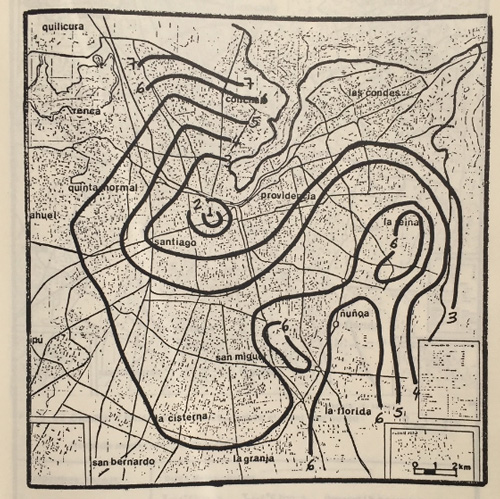 En el contexto de ese escenario, a principio de 1981 junto a Pablo Ulriksen, también académico de la Sección de Meteorología, diseñamos un proyecto para cuantificar el efecto de isla calórica en Santiago, definido como el impacto que el calor liberado por los vehículos de transporte, así como por las actividades industriales y residenciales tiene sobre el campo térmico superficial. Un estudio preliminar realizado en el invierno de 1976, que incluyó mediciones con aspirosicrómetros portátiles en distintos puntos de la ciudad, había mostrado que el efecto era más significativo durante la noche (Aceituno y Ulriksen, 1981). Con la participación de Fernando Salinas E., un egresado de Ingeniería Civil que utilizó esta investigación para cumplir la exigencia de su Memoria de Título, se diseñó un plan de mediciones de temperatura mediante vehículos que debían recorrer la ciudad a partir de la hora de levantamiento del toque de queda nocturno, vigente desde el golpe de Estado en septiembre de 1973, y que por entonces se extendía entre las 02:00 y 05:30 am.