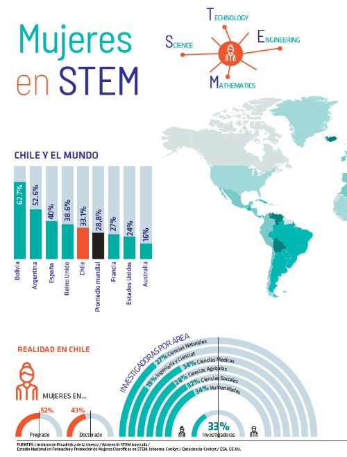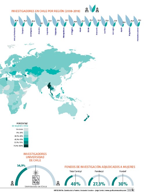 En el área de investigación la situación es similar. De acuerdo a los datos del Instituto de Estadísticas de la Unesco, el 33,1% de los investigadores en Chile son mujeres, proporción que está sobre el promedio mundial (28,8%), pero bajo el de Latinoamérica y el Caribe, que llega a 45,4%. Según la Comisión Nacional de Investigación Científica y Tecnológica (Conicyt), el 31,51% del total nacional de publicaciones es liderado por mujeres, quienes se adjudican el 25% de los fondos de financiación regular y el 30% de los Fondef, de investigación aplicada.