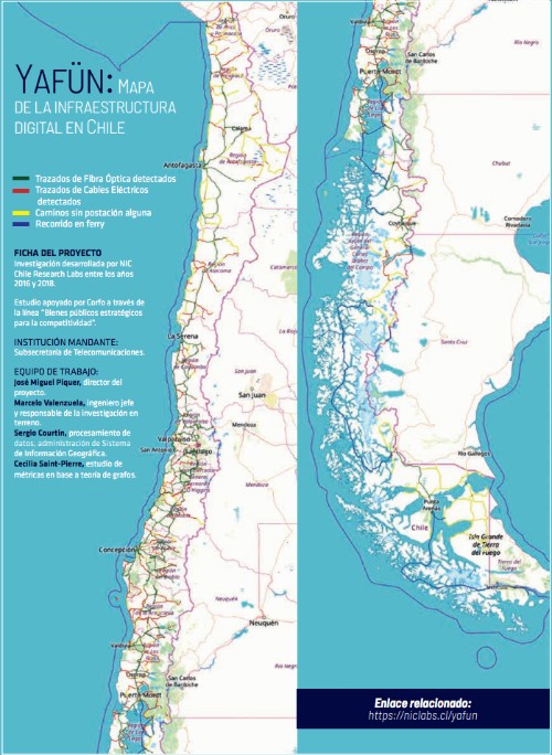 El Laboratorio ha creado un mapa de la infraestructura digital en Chile, para modelar qué tan tolerante a fallas es y cómo se puede hacer mejor, teniendo en cuenta que la larga y estrecha forma de nuestra geografía no ha favorecido la conformación de redes redundantes. Para crear el catastro hubo que recorrer más de 25 mil kilómetros por caminos principales y secundarios, debido a que la información disponible era parcelada y obsoleta.