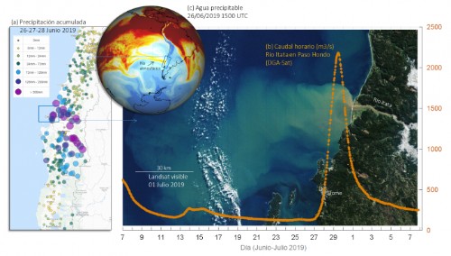 En la última semana de junio de 2019 hubo fuertes lluvias que afectaron las regiones del Biobío y la Araucanía, produciendo acumulaciones de entre 100 y 300 milímetros en los tres días que duró este evento (Figura 1, panel a) e incrementando rápidamente el caudal de los ríos en ambas regiones. Por ejemplo, el caudal del río Itata, en las cercanías de su desembocadura, se incrementó más de diez veces respecto a los valores previos, llegando a superar los 2.000 metros cúbicos por segundo (Figura 1, panel b). Además, se reportaron numerosas inundaciones en sectores rurales y urbanos, junto a cortes de caminos por deslizamientos de tierra. Parte de estos deslaves llegaron a los cauces, aumentando notablemente su carga de sedimentos, lo que resultó, finalmente, en una masiva pluma de los ríos extendiéndose en la zona costera por decenas de kilómetros desde su desembocadura, como se aprecia en la imagen satelital de fondo del panel c. Aunque los efectos de este temporal fueron mayormente negativos, es bueno recordar aquí que estas plumas de ríos aportan nutrientes esenciales para la mantención de los ecosistemas costeros durante los meses de invierno (Masotti et al. 2018).