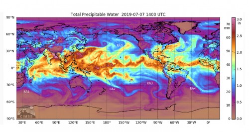 Figura 2. Contenido total de vapor de agua en la tropósfera para el día 7 de julio de 2019. Esta variable es equivalente a tomar todo el vapor en la columna troposférica y condensarla, por lo cual se expresa en milímetros por metro cuadrado. Varios ríos atmosféricos (RA1, RA2…) son evidentes en este día. La imagen es obtenida en base a mediciones satelitales en el rango de las microondas y están disponible en tiempo real en el siguiente ENLACE.