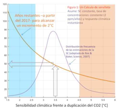 Hasta ahora todo parece un ejercicio bastante académico, pero veremos qué diferencias en las estimaciones del SC tienen consecuencias prácticas de gran envergadura. Para eso, consideremos que es imperativo que la temperatura planetaria no supere 2°C respecto al valor preindustrial. (Como la temperatura ya se ha incrementado 0.8°C, debemos limitar a 1.2°C el calentamiento en las próximas décadas). La figura 1 muestra los años que restan -a partir de hoy- para alcanzar los 2°C (curva naranja), suponiendo que la tasa de aumento de las concentraciones se mantiene igual a la observada en las últimas décadas (cerca de 2 ppm por año), que el equilibrio climático es muy rápido y que la sensibilidad climática es constante. Estas suposiciones probablemente no se verifiquen, pero no son demasiado lejanas a la realidad permitiendo hacer este "cálculo de servilleta" de nuestro margen de acción para evitar un calentamiento peligroso.