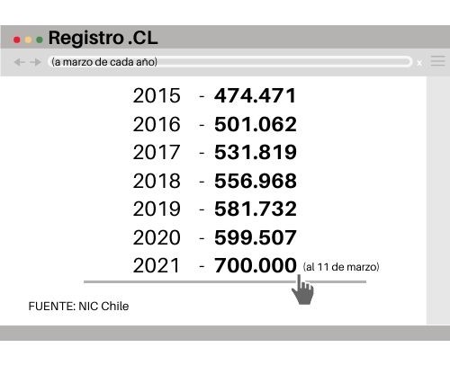 De acuerdo a NIC Chile -entidad encargada de administrar el registro de nombres de dominio, dependiente de la U. de Chile- en el último año el registro de dominios .CL aumentó en más de 100 mil, principalmente impulsado por la llegada del COVID-19 al país. “El inicio de la pandemia generó un fuerte incentivo para la digitalización y muchas actividades tuvieron que migrar súbitamente al mundo 'online'. Eso se vio reflejado en el número de dominios inscritos, cuyo crecimiento se aceleró fuertemente y en menos de un año llegó a los 700 mil”, informó el centro.