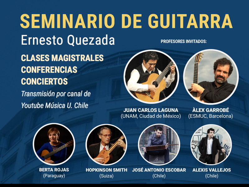 El Seminario de Guitarra Ernesto Quezada se desarrollará durante el segundo semestre de 2021, partiendo el 16 de agosto con las actividades a cargo del guitarrista Juan Carlos Laguna. Laguna dictará conferencias el miércoles 18, entre las 11:00 y las 12:30 y el viernes 20 de agosto, entre las 13:00 y 14:30 horas. La primera será sobre La guitarra clásica en México: Enseñanza, Festivales y Concursos; la segunda se denomina La primera vista: Metodología para el estudio de la lectura a primera vista en la guitarra. El sábado 21 de agosto, a las 18:00 horas, ofrecerá un concierto acompañado por el arpista Emmanuel Padilla. El repertorio incluye el estreno mundial de la obra Variaciones sobre las Folías del español Juan Erena, junto a piezas del italiano Simone Lannarelli y los mexicanos Marco Aurelio Alvírez y Eduardo Soto. El cierre será con tres piezas de Astor Piazzolla.