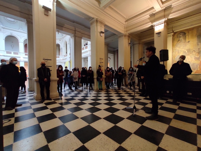 "Me gustaría como Decano de la Facultad de Artes, y a título de toda la comunidad universitaria, dirigir unas palabras de reconocimiento a la trayectoria de Francisco Brugnoli, quien junto con ser uno de los artistas más consecuentes e importantes de este país, ha dirigido a lo largo de veinte años -con infinita entrega y por medio de una gestión de lujo- nuestro Museo de Arte Contemporáneo. Esta gestión la desarrolló representando el espíritu de nuestra facultad en los ámbitos de la esfera pública, diseñando exposiciones únicas, reuniendo obras y muestras de todas partes del mundo, sacando adelante en el día a día un museo que, como sabemos, no siempre contó con todos los recursos que habríamos querido, y generando un disponible crítico de gran altura. Esto lo hizo con visible destreza, de manera responsable y, sobre todo, luciendo una gran honestidad intelectual, la misma que lo llevó en calidad de artista a luchar por otorgarle al arte el lugar que le corresponde: el de su participación activa en la construcción de un imaginario público abierto, disensual y creativo.