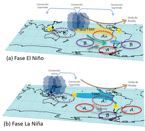 Figura 3. Esquema de la circulación atmosférica durante años de El Niño (panel a). En estos periodos ocurre un debilitamiento del Anticiclón del Pacifico (óvalo rojo segmentado). Las aguas superficiales anormalmente cálidas (área amarilla) en el Pacifico tropical central favorecen nubes convectivas y de gran desarrollo vertical en esa zona. Las zonas con convección suprimidas se indican mediante el símbolo del sol. La circulación inducida por esta actividad convectiva tropical es capaz de perturbar el campo de presión en latitudes subtropicales y medias, como muestra la secuencia de núcleos anómalos de baja-alta-baja presión (óvalos rojos y violetas), produciendo una onda de Rossby (flecha gris) en la atmósfera sobre el Pacifico. El establecimiento de anomalías de alta presión al oeste de la Península Antártica, junto al debilitamiento del Anticiclón del Pacifico, favorece la llegada de sistemas frontales a Chile central durante los inviernos de El Niño. Lo contrario ocurre durante los inviernos de los años de La Niña como se esquematiza en el panel (b).