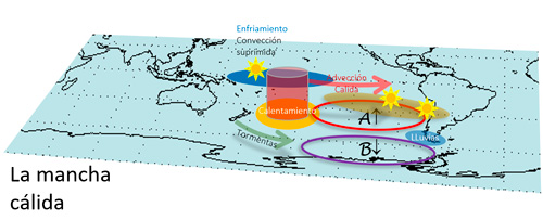 Figura 7. Esquema de la circulación atmosférica inducida por la mancha cálida. La mancha cálida es un sustancial y prolongado calentamiento del océano en el Pacifico subtropical suroccidental (óvalo amarillo cerca de Nueva Zelanda). Esta condición más cálida llega a la tropósfera (cilindro) y resulta en un incremento de la presión superficial sobre gran parte del Pacifico subtropical (óvalo rojo), intensificando el Anticiclón del Pacifico junto a una caída de presiones en la periferia antártica (óvalo violeta). Ambos elementos refuerzan la trayectoria de tormentas hacia el extremo del continente, alejándolos de Chile central y produciendo menores precipitaciones.