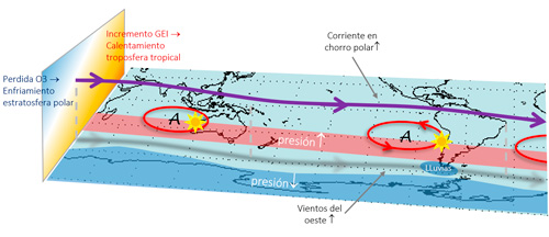 El incremento de la temperatura en gran parte del planeta durante los últimos 100 años es el aspecto más conocido del cambio climático producido por múltiples actividades humanas (Garreaud 2020a). Estas han provocado un aumento de la concentración atmosférica de gases con efecto invernadero (GEI) y una disminución del ozono en la estratósfera. El aumento de los GEI ha causado un calentamiento marcado en la tropósfera alta sobre los trópicos y subtrópicos, mientras que la disminución del ozono ha producido un enfriamiento de la estratósfera sobre latitudes altas del hemisferio sur. Estas tendencias divergentes de la temperatura del aire acrecientan el contraste térmico norte-sur entre los 10 y 15 km de altura, intensificando el anillo de máximo viento del oeste conocido como la corriente en chorro polar (Figura 8). La aceleración de los vientos en altura es transferida hacia abajo causando la intensificación de los oestes en superficie sobre el océano Austral. La intensificación del flujo demanda una readecuación del campo de presión a nivel del mar, causando un aumento circumpolar de presiones en torno a los 40°S en las últimas décadas y una caída de la presión sobre la Antártica, lo que se conoce como la fase positiva del modo anular del sur (SAM, por sus siglas en inglés).