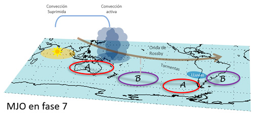 Figura 6. Esquema de la circulación atmosférica durante una de las fases de la Oscilación de Madden – Julian (MJO, fase 7). En esta condición la convección está muy activa sobre el extremo oeste del Pacifico ecuatorial y suprimida sobre el océano Índico. Ondas de Rossby emanadas desde el núcleo convectivo (flecha gris) producen una sucesión de núcleos anómalos de presión sobre el Pacifico extratropical (óvalos rojos y violetas). El centro de altas presiones al oeste del Cono Sur de América propicia la llegada de sistemas frontales a Chile central.