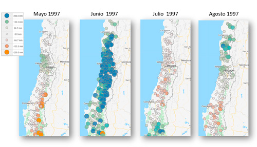 Figura 5. Variaciones intraestacionales de la precipitación en Chile central. Los mapas indican la anomalía (desviación respecto del promedio de largo plazo, 1980-2010) de la precipitación mensual durante el invierno de 1997 registrada en un conjunto de estaciones meteorológicas. La escala común (en milímetros) se presenta sobre el panel de la izquierda. El año 1997 fue uno de los más lluviosos del registro (ver la Figura 1), pero gran parte de las precipitaciones se concentraron en cuatro tormentas durante junio. Por el contrario, julio fue un mes más seco que el promedio.