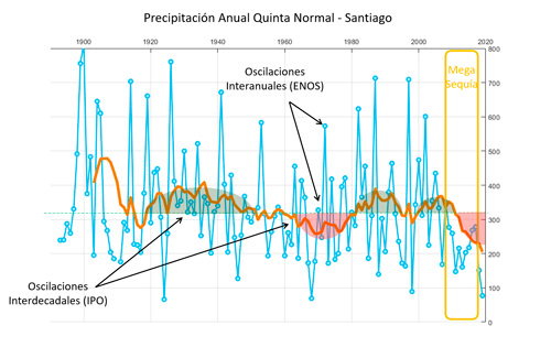 La zona central de Chile está en la transición entre una de las regiones más secas del planeta –el desierto de Atacama- y una región lluviosa en latitudes medias. Esta condición limítrofe, hace que la acumulación anual dependa de unas pocas tormentas y sea susceptible a pequeñas variaciones en la posición e intensidad del anticiclón del Pacífico subtropical y la banda de vientos del oeste en latitudes medias. Varios fenómenos de escala global –ENSO, MJO, PDO y SAM- afectan los dos elementos anteriores en distintas escalas de tiempo, desde los meses a las décadas, produciendo un régimen de precipitación muy “inestable” en Chile central. Esta variabilidad ha sido parte de la historia de nuestro territorio como queda de manifiesto, por ejemplo, en las crónicas de terribles aluviones y grandes sequías desde la conquista al siglo XIX (Vicuña Mackenna, 1877) y también en nuestra historia reciente. Aunque compleja, la dependencia de la precipitación en Chile central a modos globales ofrece algún grado de predicción en el mediano plazo mediante técnicas que están en permanente desarrollo. Superpuesta a estas variaciones, el cambio climático antropogénico cambiará el régimen de precipitaciones hacia una condición más seca, aunque no exento de peligros hidrometeorológicos (Mardones & Garreaud 2020). La magnitud de la disminución de precipitación proyectada para el resto del siglo XXI presenta un amplio rango, incluyendo un escenario en que la condición media sea similar a la actual Megasequía, la cual depende directamente del escenario de emisiones de gases de efecto invernadero.