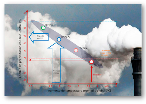 Figura 9. El futuro es abierto. Dependiendo de la cantidad de gases con efecto invernadero (GEI) que emita la humanidad durante las próximas décadas, el futuro climático de nuestro planeta (resumido en su temperatura media) y de Chile (resumido por el déficit de precipitación en la zona central) puede variar en un amplio rango. Si las emisiones de GEI continúan incrementándose (escenario RCP8.5) la concentración de CO2 a fines de siglo llegaría a unas 1000 partes por millón (ppm), más de tres veces el valor preindustrial (280 ppm), incrementando la temperatura promedio del planeta en cerca de 4 °C por encima del valor actual y reduciendo en forma permanente y en promedio las precipitaciones en Chile central en más de un 30 % respecto al presente. Por el contrario, si las medidas de mitigación comienzan a implementarse rápida y efectivamente (escenario RCP2.6, lo comprometido en el Acuerdo de Paris de 2015), las concentraciones de CO2 se mantendrían por debajo de las 500 ppm (actualmente tenemos 410 ppm), el calentamiento global no superaría los 1.5 °C y la precipitación en Chile central sufriría una perdida (promedio) de cerca del 10 % en la segunda mitad del siglo XXI.