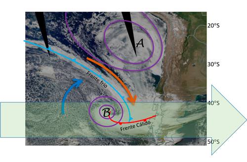 Figura 2. Principales determinantes del hidroclima de Chile central ilustrados con una imagen satelital visible de un día de invierno. Los círculos violetas corresponden a isobaras (contornos de igual presión a nivel del mar) revelando las altas presiones (A) del Anticiclón del Pacifico frente a la costa norte-centro de Chile. Más al sur se observa un centro de baja presión (B) que se mueve hacia el continente, embebido en el cinturón de vientos del oeste (flecha verde gruesa), generalmente localizado en latitudes medias (40-50°S). La circulación ciclónica (a favor de los punteros del reloj como lo indican las flechas curvadas) en torno a la baja presión favorece la ocurrencia de un frente frío (línea celeste) y cálido (línea roja). En ambos frentes, aire cálido y húmedo ascienden sobre aire frío, generando nubosidad y precipitación.