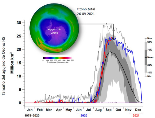 Figura 2. La curva roja representa la evolución diaria durante el año 2021 del tamaño del agujero de ozono sobre la Antártica; la curva azul muestra el mismo parámetro, pero en el año 2020; y en color negro se ve el promedio de largo plazo. El globo muestra el ozono total para el 26 de septiembre de 2021, indicando el agujero polar. Fuente: Adaptado de NASA Ozone Watch.