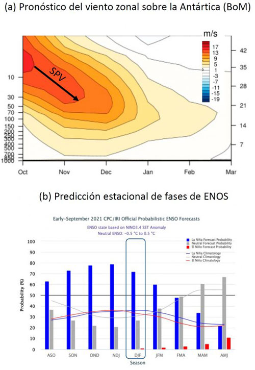 Figura 4. Dos titanes en colisión. El panel A muestra el pronóstico del viento zonal sobre la Antártica para los próximos cinco meses (generado por el modelo ACCESS en el Bureau of Meteorology de Australia, gentileza de Eun-Pa Lim). Los colores naranjo indican vientos del oeste sobre el promedio que progresan desde la estratósfera hacia abajo alcanzando la tropósfera media en diciembre. El panel B es la predicción de la probabilidad de ocurrencia de las fases de ENOS para los próximos meses, desarrollado por el IRI-CPC. La probabilidad de una condición de La Niña entre diciembre 2021 y febrero 2022 es superior al 70 %.