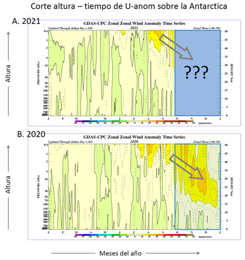 Figura 3. El panel A (año 2021) muestra la evolución de las anomalías (desviación de la climatología) del viento zonal a distintos niveles verticales sobre la Antártica hasta el día 27 de septiembre de este año. El panel B representa las anomalías para todo el año 2020. Los colores amarillos y naranja indican viento del oeste más intensos que el promedio histórico. Fuente: Adaptado de National Weather Center – Stratosphere.