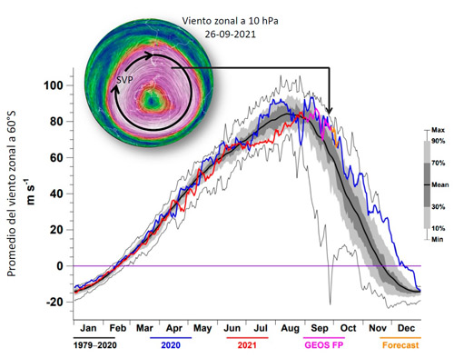 Figura 1. La curva roja representa la evolución diaria durante el año 2021 del viento zonal a 60°S y 10 hPa (unos 30 km de altura); la curva azul muestra el mismo parámetro, pero en el año 2020; y en color negro se ve el promedio de largo plazo. El globo muestra el viento zonal a 10 hPa para el 26 de septiembre de 2021, indicando el actual Súper Vórtice Polar. Fuente: Adaptado de NASA Ozone Watch.