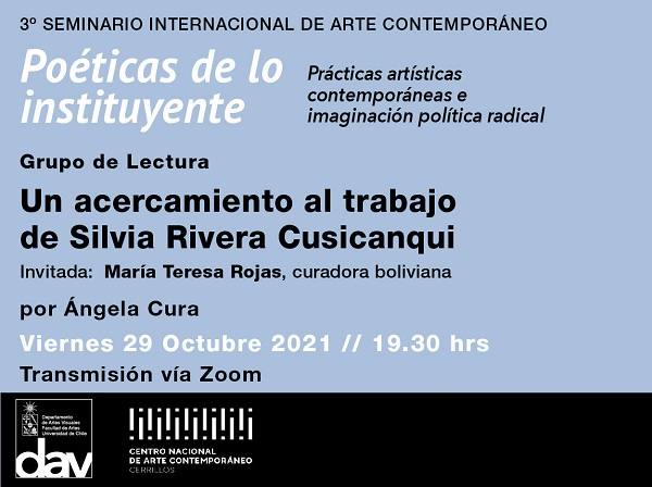 La segunda mesa “Un acercamiento al trabajo de Silva Rivera Cusicanqui” comienza a las 19:30 hrs. será moderada por la profesora del DAV, Ángela Cura, en la que participa María Teresa Rojas, curadora boliviana.